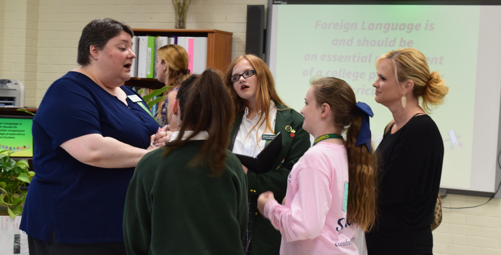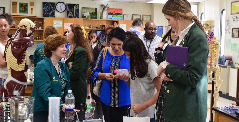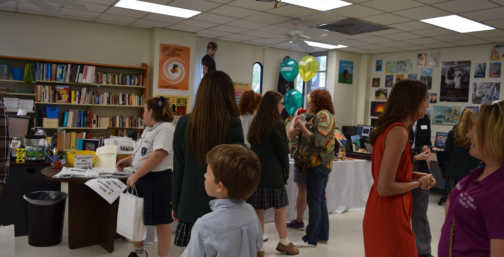 In the Esplanade Building, guests met the amazing Religion Department who had some of the religion books and projects on display. Next, tour guides took families to the beautifully painted purple room where Mother Cabrini actually stayed during her visits to New Orleans. Students and their families next stopped by Crescent Hall where they saw performances by some of the members of Drama Club who performed in the black box theatre. Students then entered the music room where they heard the angelic voices of Cabrini's Chamber Ensemble followed by the weight room filled with tons of work out equipment to strengthen our athletes.